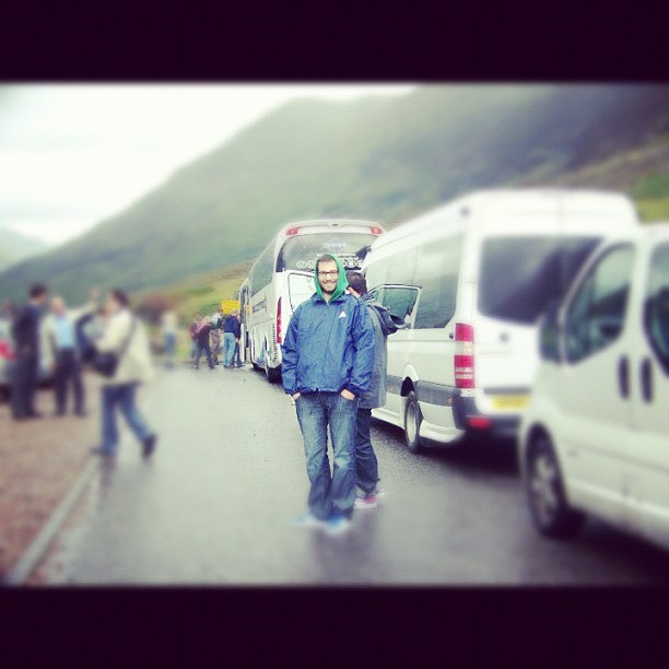 Míranos, agora estamos no Castelo de Edimburgo. Andaban a tirarnos outra foto baixo a chuvia. Felices. Este chuvasqueiro si é da miña talla e Andrés segue coa súa coroa na cabeza. Si, penso para min, o momento máis feliz da miña vida.